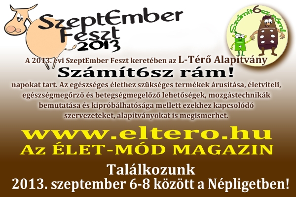 A 2013-as SzeptEmber Feszt keretében az L-Térő Alapítvány „Számít6sz rám” néven a ma megszokottól(?) eltérő életvitellel, mozgásformákkal, táplálkozással, gondolkodással és az egészséggel kapcsolatos programot tart. Ebben a fentiekhez kapcsolódó bemutatókat nézhet meg, állapotfelméréseken vehet részt, különböző masszázsfajtákat és mozgáskultúrákat próbálhat ki és termékeket is vásárolhat. |